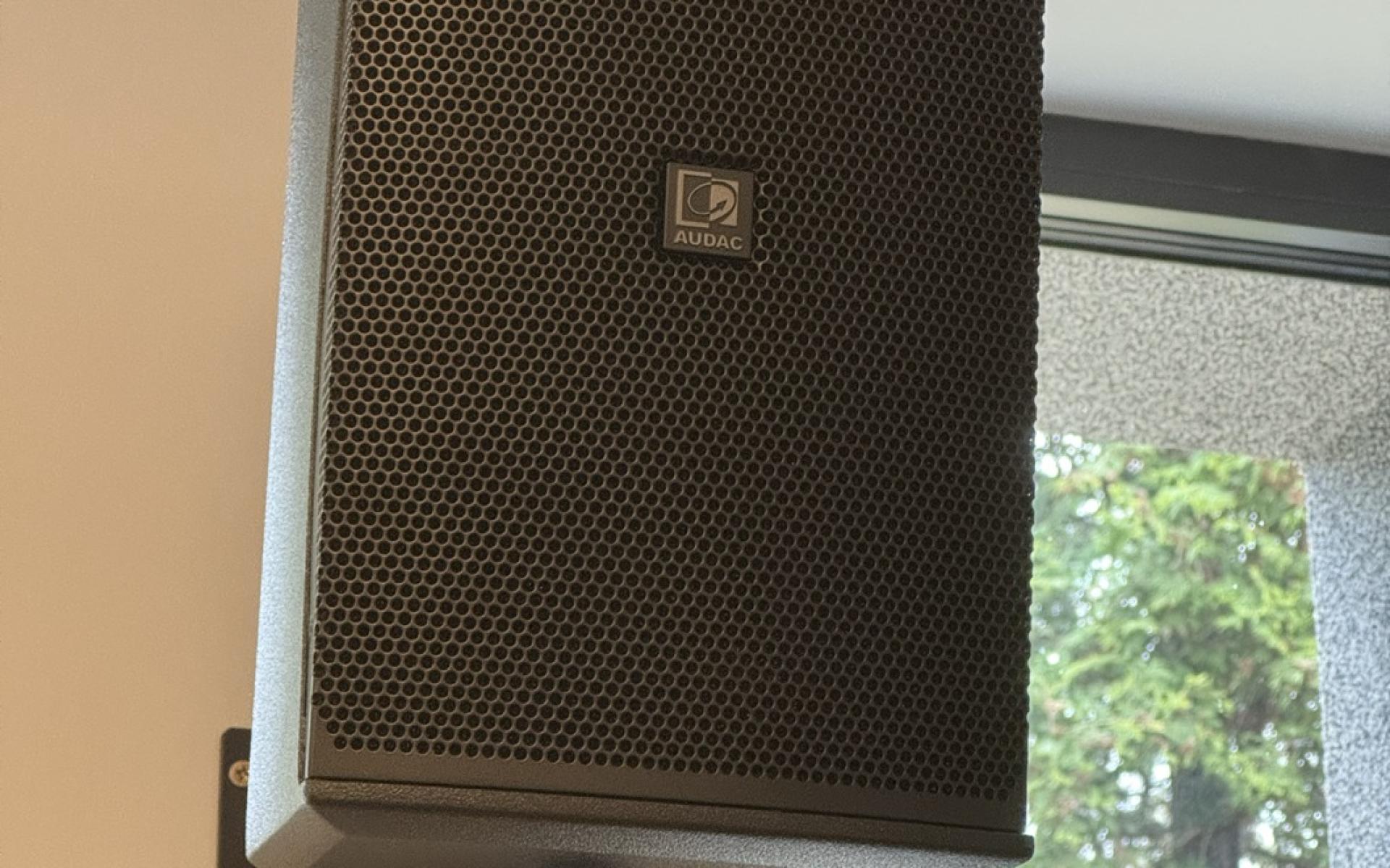 Główne nagłośnienie stanowią głośniki naścienne AUDAC VEXO110/B zasilane wzmacniaczem AUDAC EPA252.